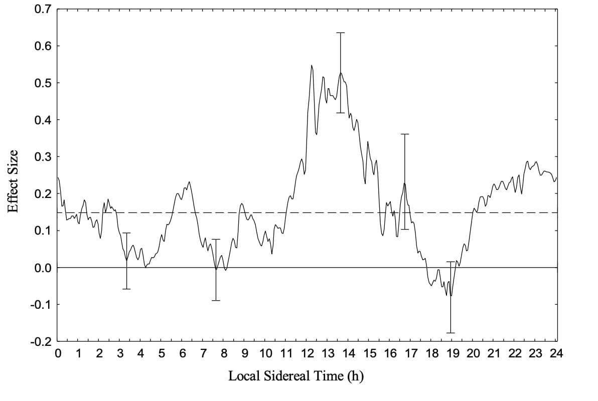 One of the most fascinating aspects of ESP research is the reported correlation between ESP outcomes and local sidereal time (LST), which measures time relative to the stars. I've written about this correlation in the past. It was first reported by Spottiswoode (1997b), who observed that ESP effect size peaked around 13:20 LST and dropped near zero at approximately 18:10 LST.