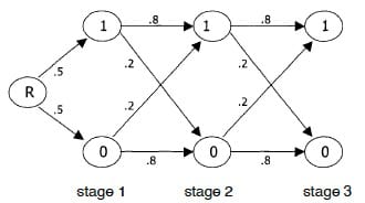 The image above details how a three stage Markov chain was implemented in the experiment. A random number generator was used to produce an initial state of either a 0 or 1, and then subsequent stages in the chain provided an opportunity for the participant to "nudge" via intention the subsequent random numbers in the direction of the desired outcome based on weighted probabilities.