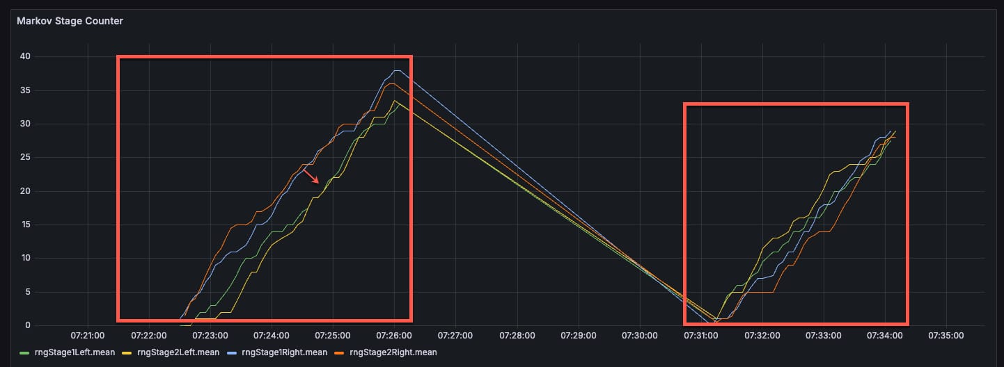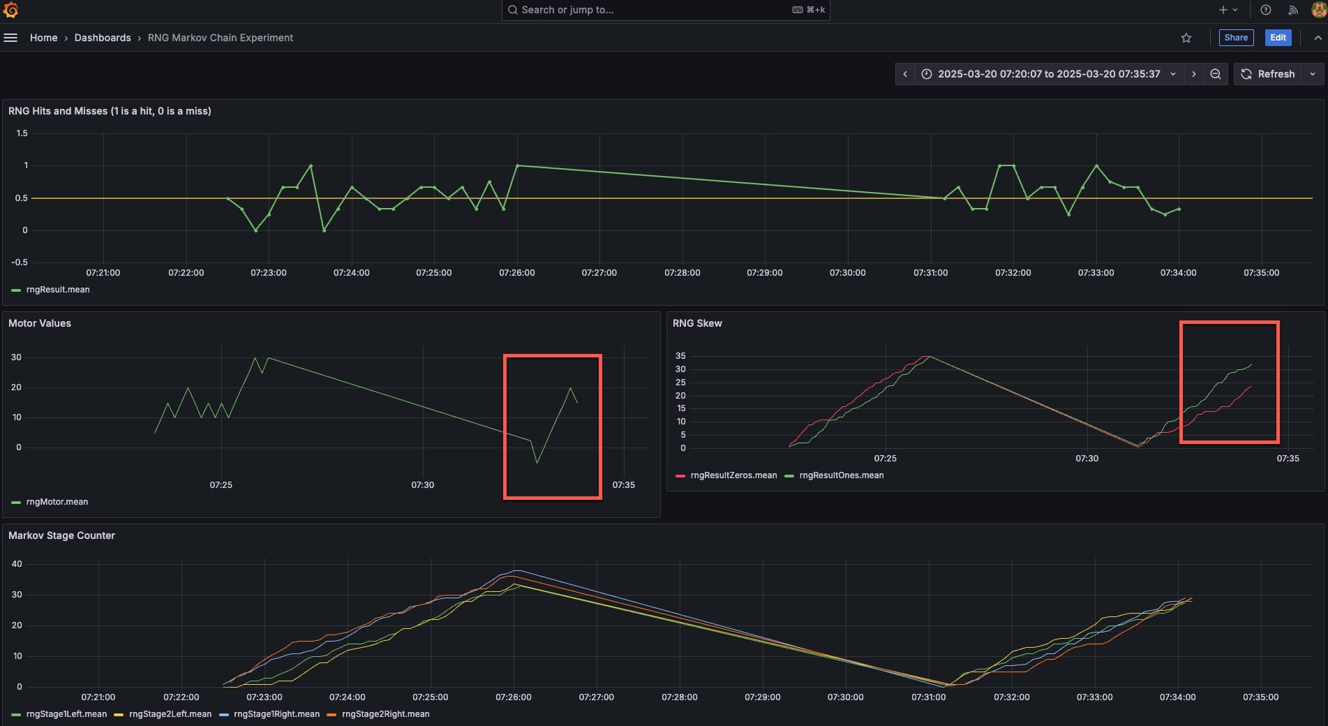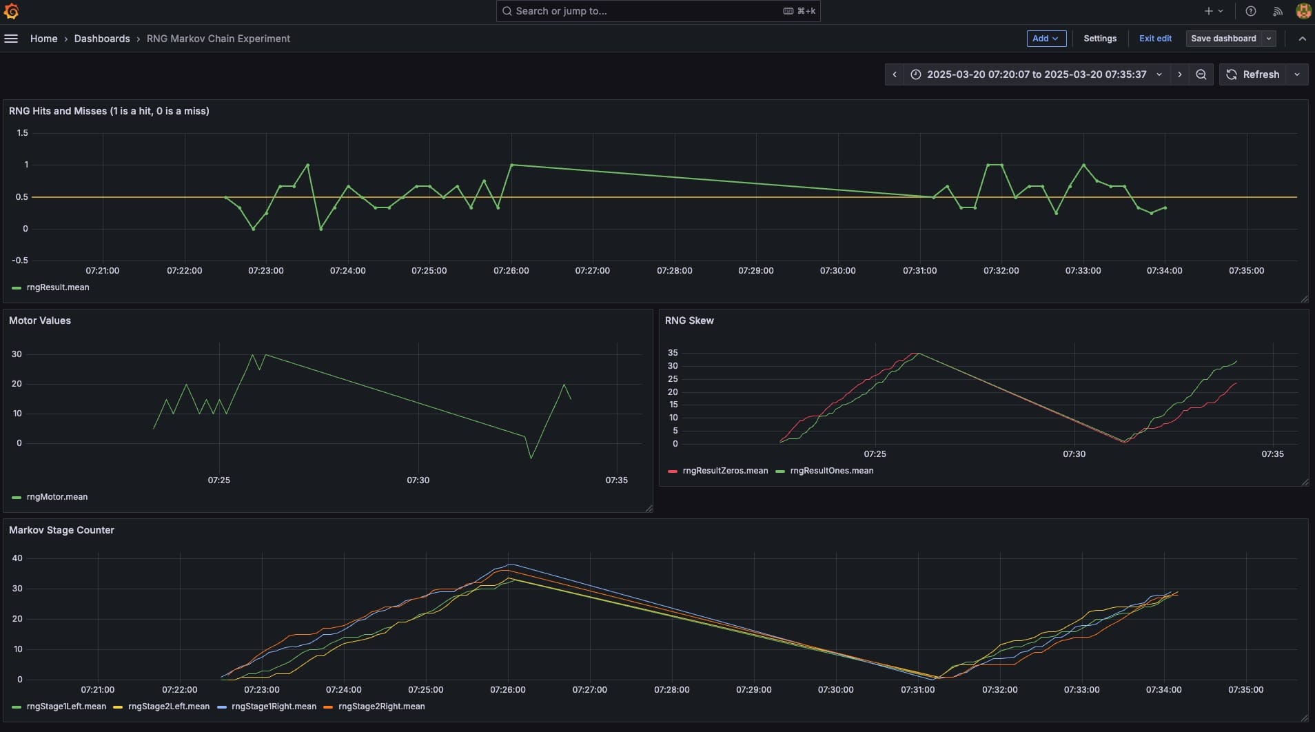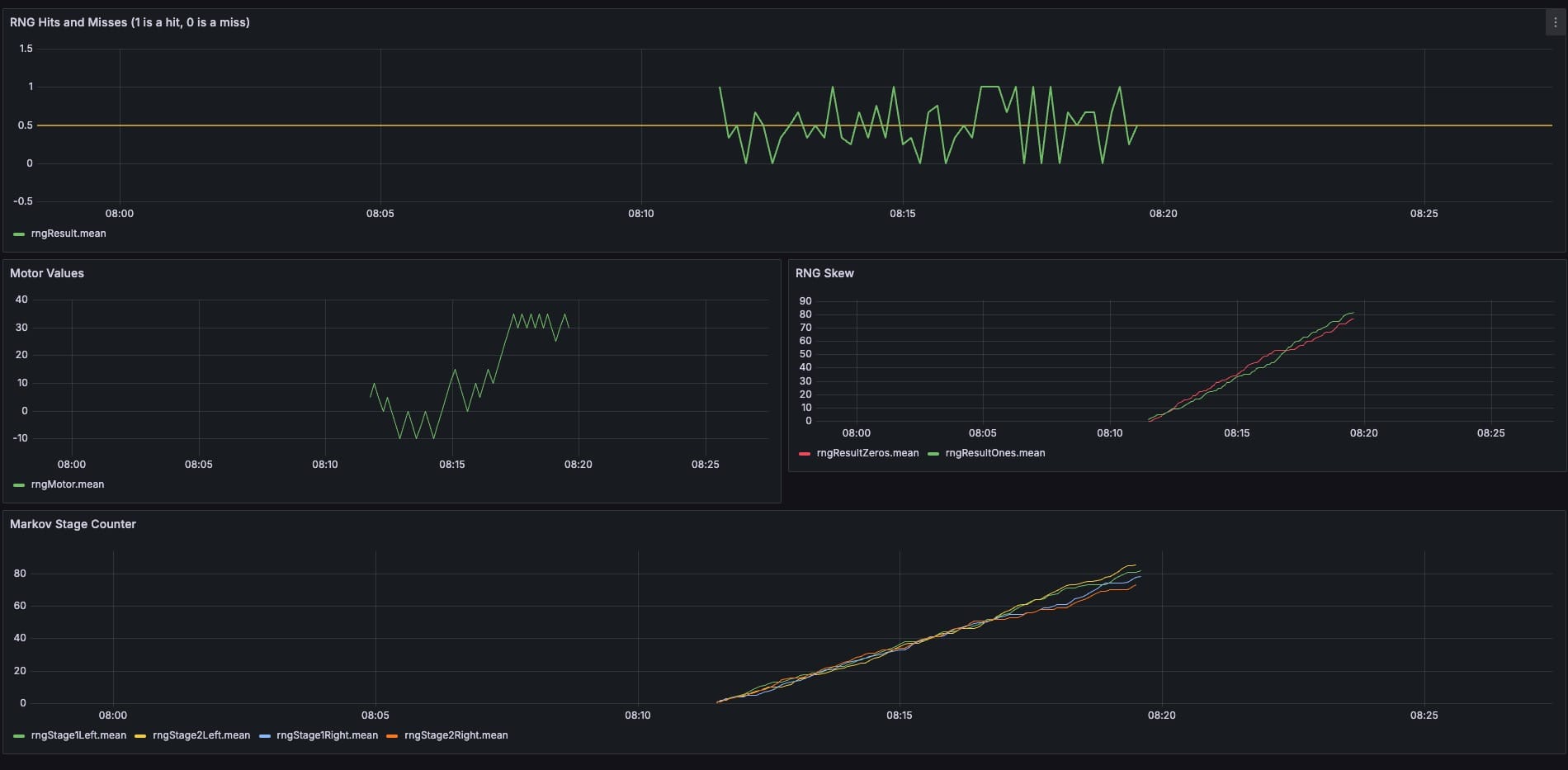 During each trial, the system captures and charts data in real-time. Below is an example of the analysis dashboard. I record various metrics including the frequency distribution of 1's and 0's generated by the hardware RNG, the robotic apparatus motor control values, progression pathways through the Markov chain computational model, and additional relevant parameters.