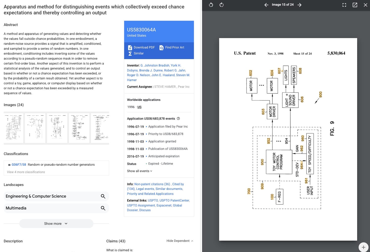 In his book, Radin describes an experiment investigating consciousness-physical system interaction using an RNG with a Markov chain processing method. Notably, one of Radin's publications, 'Evidence for Consciousness-Related Anomalies in Random Physical Systems,' is cited as a reference in the patent itself, so I thought I might be on to something.