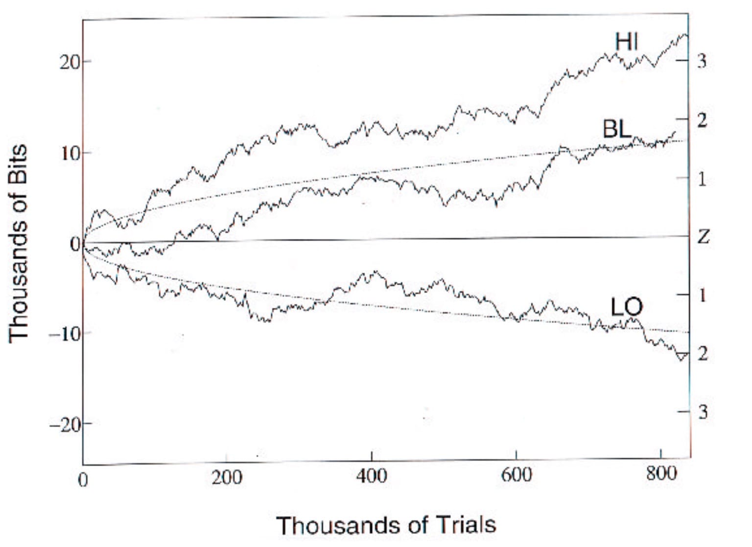 The above diagram is from the study and shows the cumulative deviation from the expected random results. HI represents the subjects intention to skew the random bits high, and the LO represents the opposite. BL represents a baseline - trials where the subjects were told not to try to influence the results.